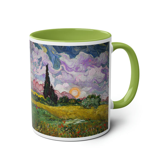 Van Gogh's Wheat Field with Cypresses (1889) - Sunset Fine Art Print Two-Tone Coffee Mugs, 11oz